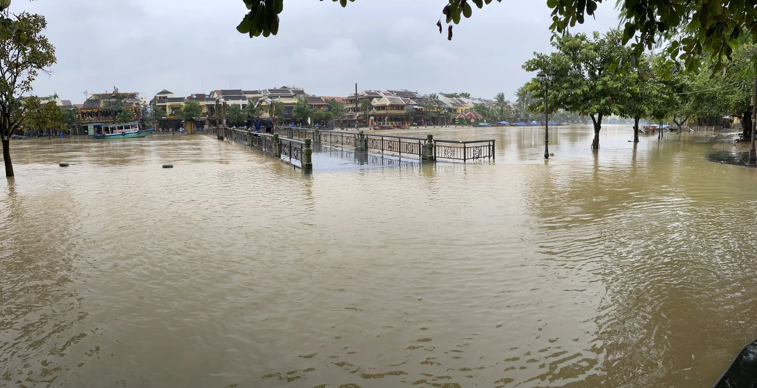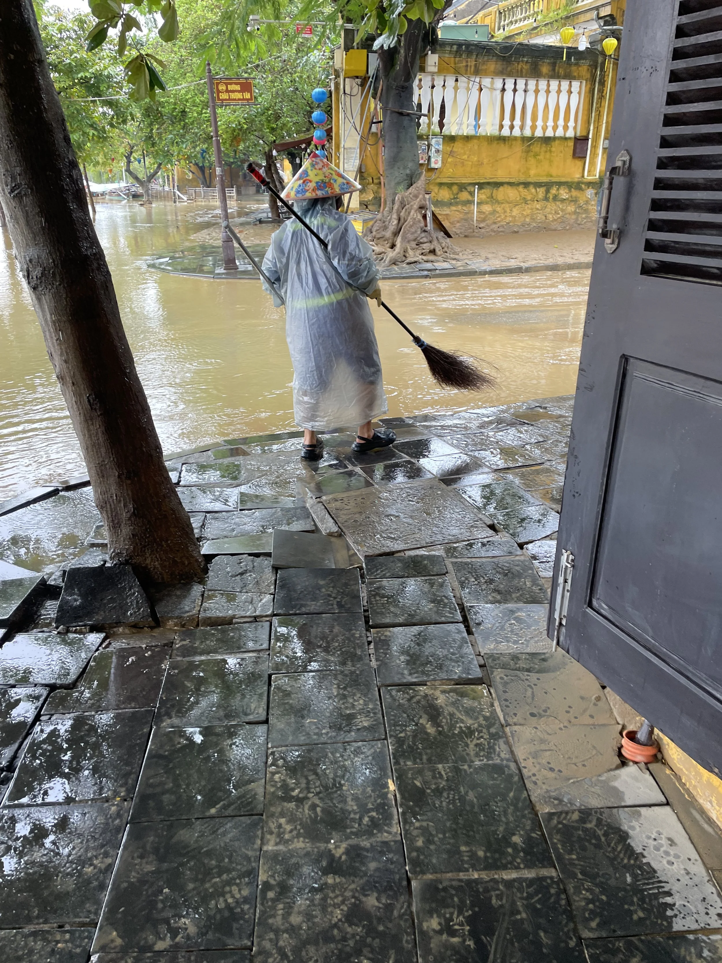 The Thu Bon river has risen, fallen, risen and fallen again. We have walked the Old Town and had to navigate by what streets are and aren’t underwater. Also in the town a few days ago only the stone bollards separating the footpath and the quick-flowing deep river-water demarcated between relative safety and being swept away. Street sellers hawk umbrellas and plastic ponchos, and the overriding smell of damp persists, inside and out.